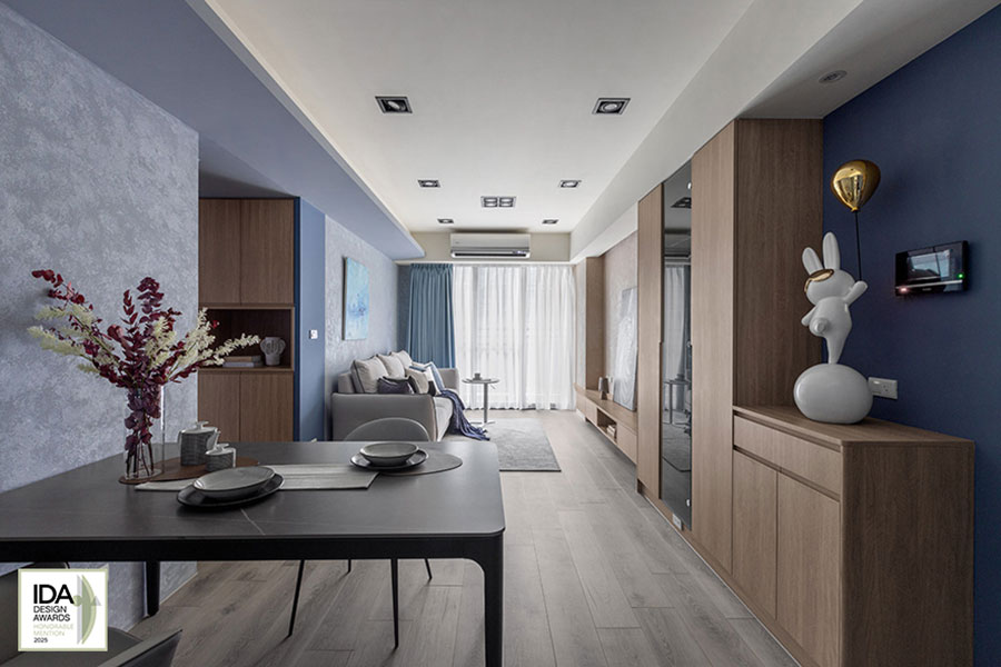 美國IDA國際設計大獎自創新性、實用性和發展性等多種面向為評選標準,旨在發掘、表彰「設立新標準」與「突破室內設計界限」、「改變人們生活和工作空間」的優秀設計師及團隊。2025年度賽事中,艾美幸福設計 設計總監 許捷甯 攜住宅作品《光韻》角逐殊榮;其設計靈感汲取職業為機師的屋主工作日常——將在萬尺高空俯瞰的雲海與天光變幻,化為空間中層疊的藍調與灰白色彩;之中首度引入德國AURO藝術塗料,以手工複合技法於牆面塑造起伏質感,搭配暖木色系點綴其間,讓居者彷彿置身雲端,感受晨曦與暮色的自然流轉,高度契合此賽事多方理念,榮獲「Honorable Mention」佳績!