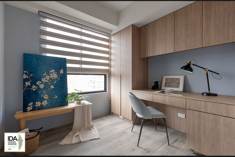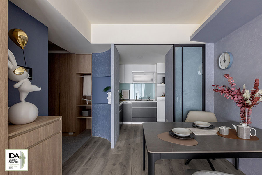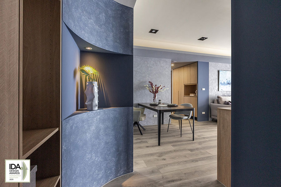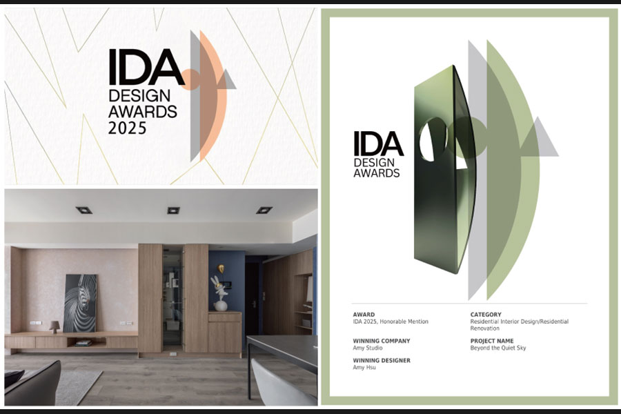 美國IDA國際設計大獎自創新性、實用性和發展性等多種面向為評選標準,旨在發掘、表彰「設立新標準」與「突破室內設計界限」、「改變人們生活和工作空間」的優秀設計師及團隊。2025年度賽事中,艾美幸福設計 設計總監 許捷甯 攜住宅作品《光韻》角逐殊榮;其設計靈感汲取職業為機師的屋主工作日常——將在萬尺高空俯瞰的雲海與天光變幻,化為空間中層疊的藍調與灰白色彩;之中首度引入德國AURO藝術塗料,以手工複合技法於牆面塑造起伏質感,搭配暖木色系點綴其間,讓居者彷彿置身雲端,感受晨曦與暮色的自然流轉,高度契合此賽事多方理念,榮獲「Honorable Mention」佳績!